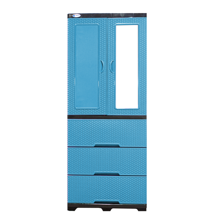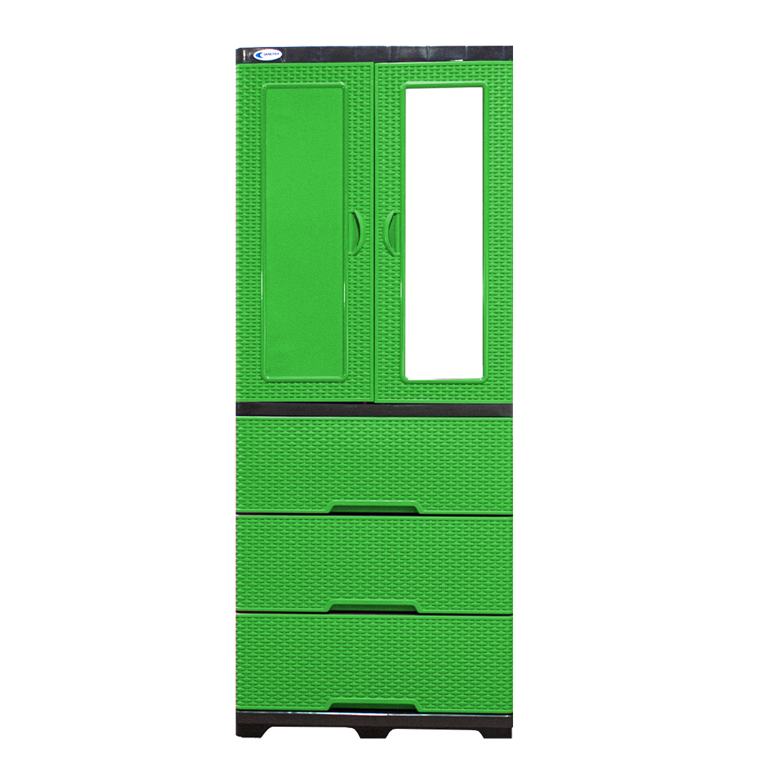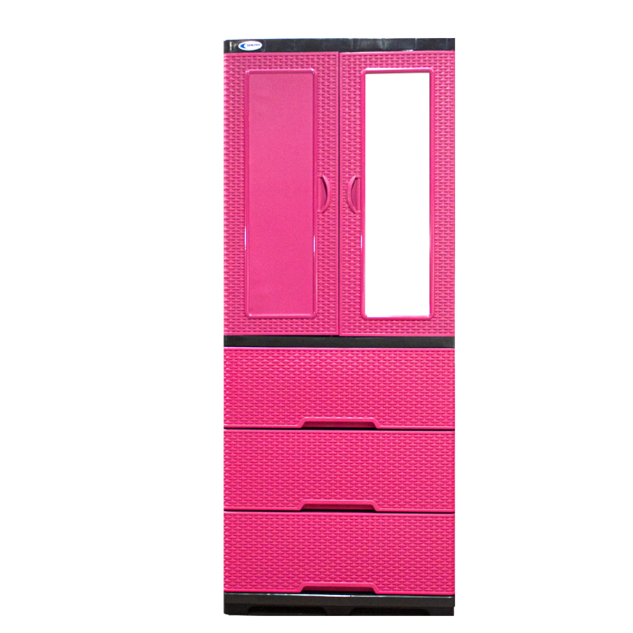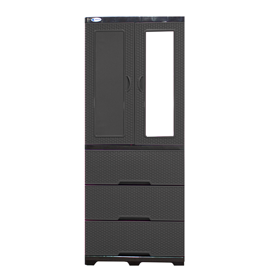 El armario CHIA, posee 2 puertas, con 2 niveles internos y 3 gavetas. Lavable y de alta calidad, su peso liviano facilita movilizarlo sin problema.