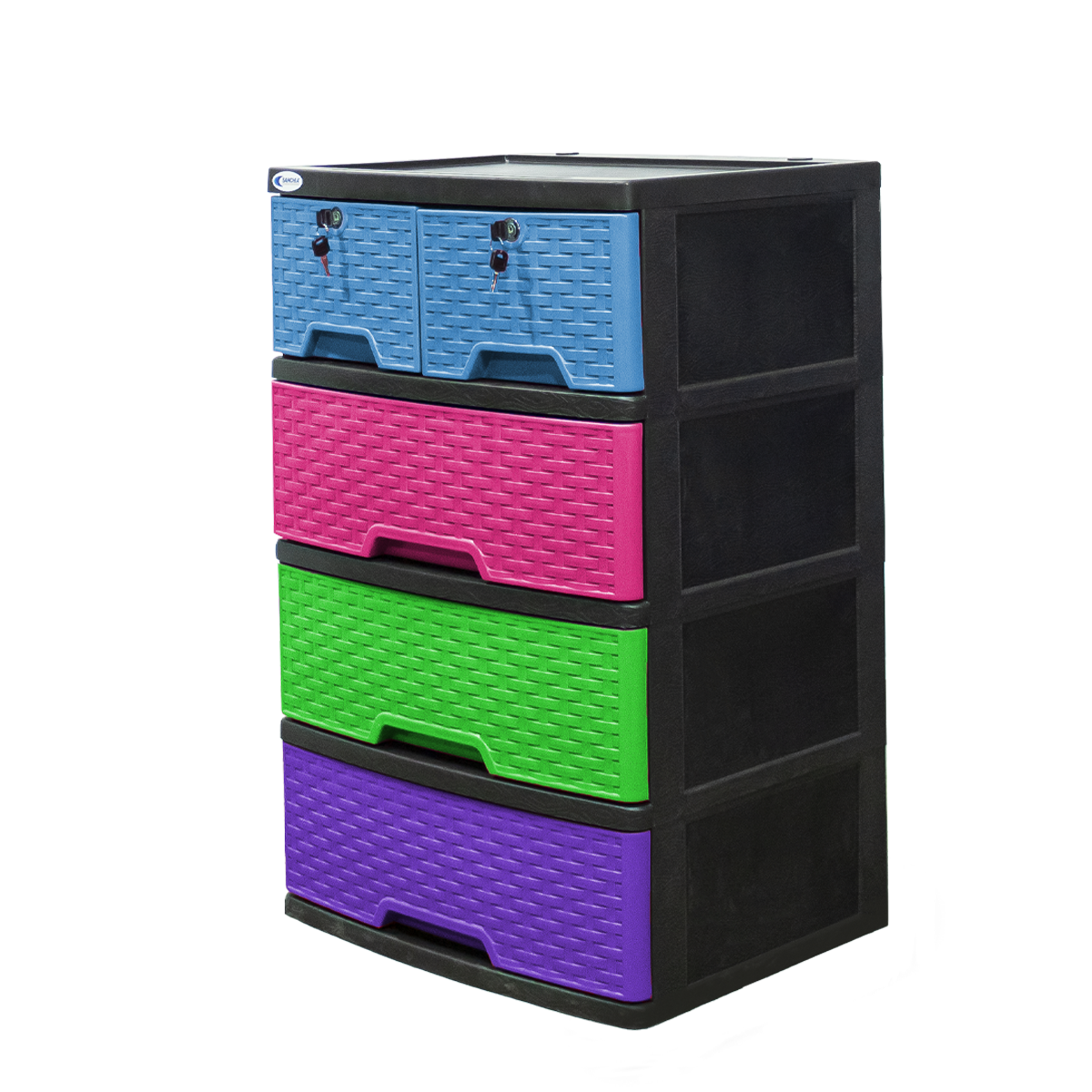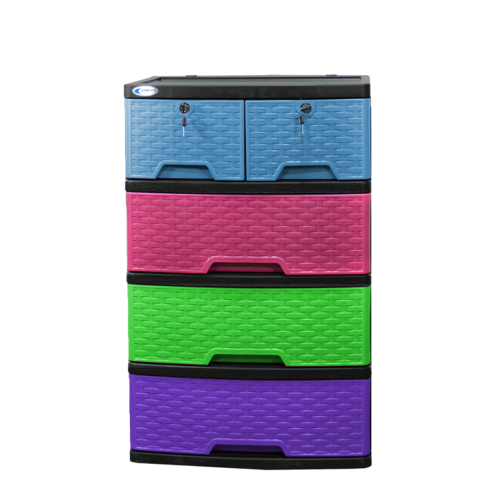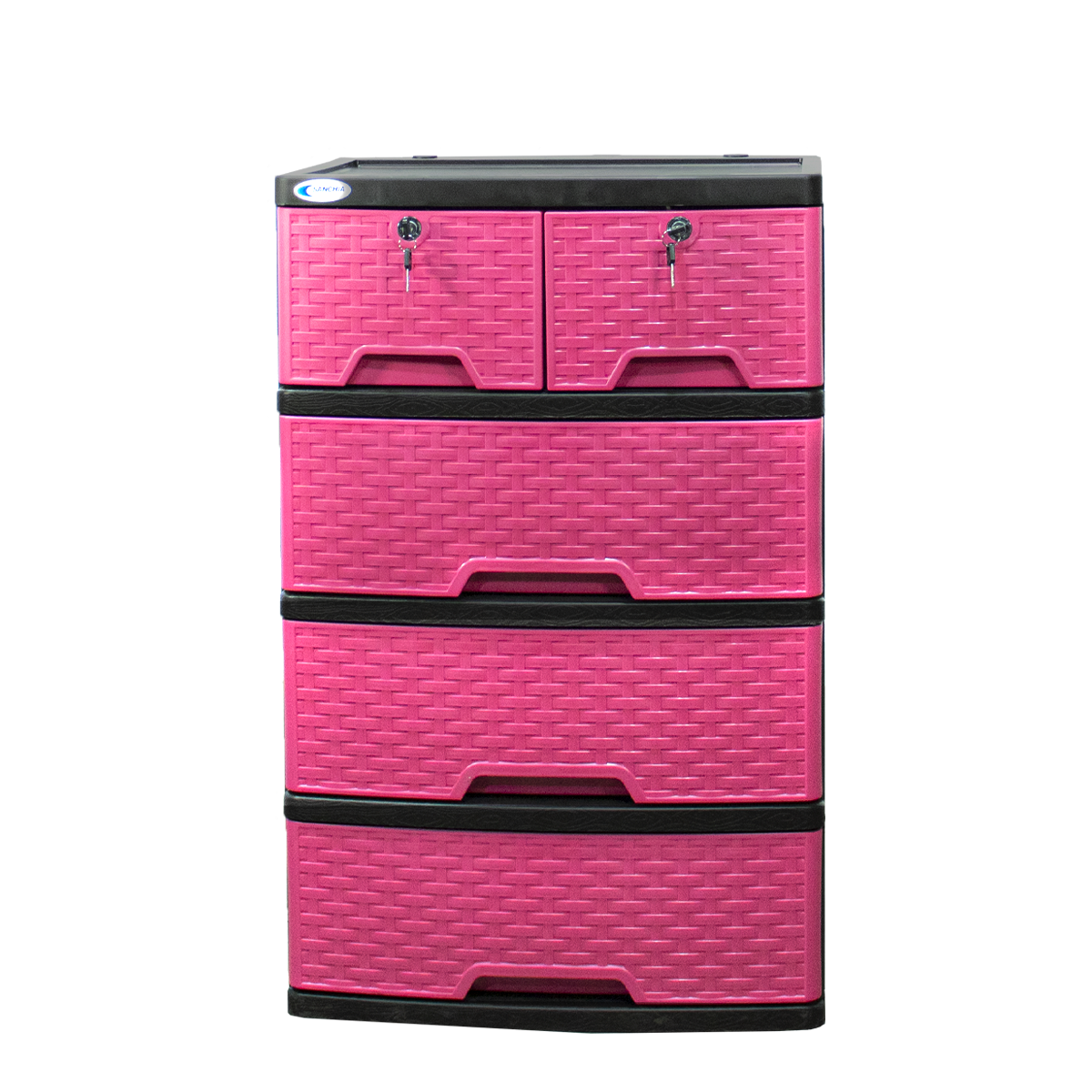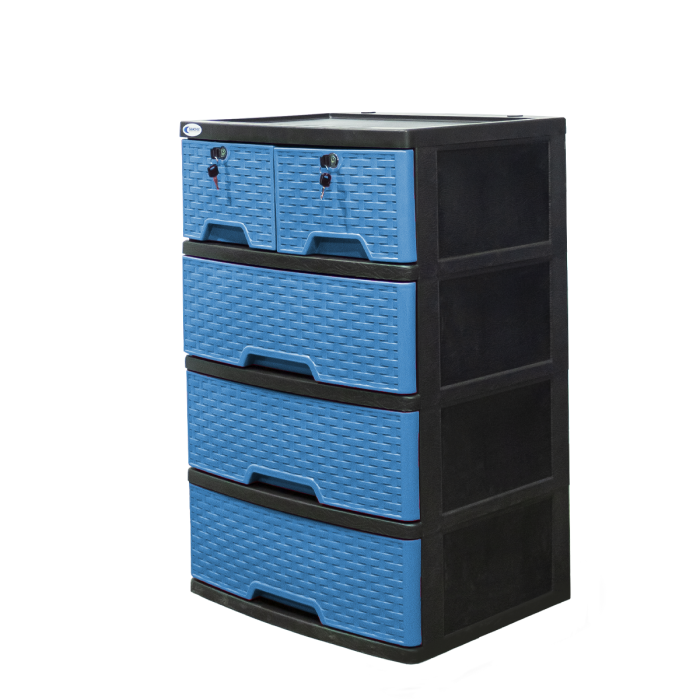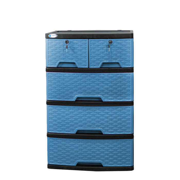 Gavetero 100% plástico, con acabado ratán en sus 5 gavetas, en variedad de colores y con rodos para fácil desplazamiento, es el mueble ideal para cualquier habitación.
